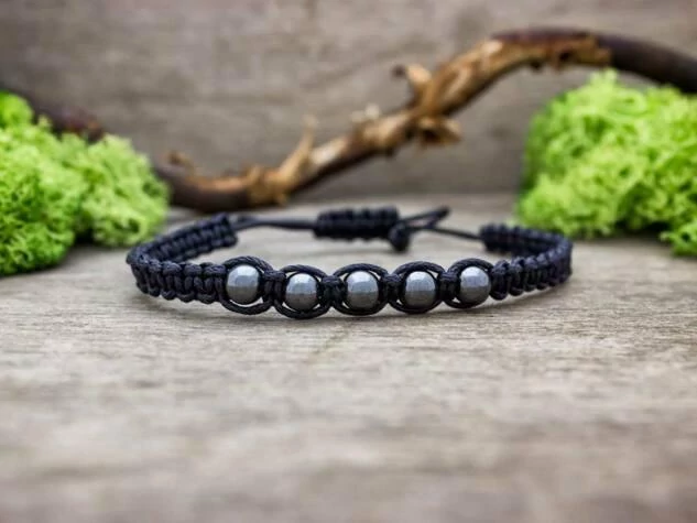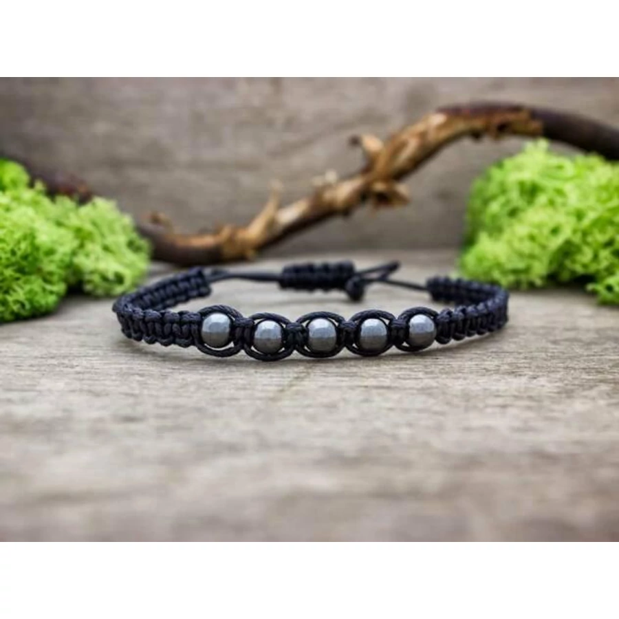 Fekete színű makramé karkötő 6mm-es hematit féldrágakő gyöngyökkel.