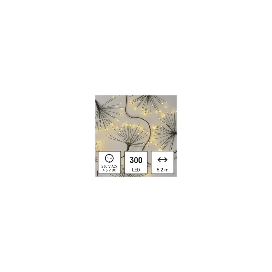 termék: nano lánc, fény színe: meleg fehér, méretek: 5,2 m, használat: beltéri, időzítő, távvezérlő: nem, funkció: világít, tápellátás típusa: AC (hálózati) adapter, forma: nano, LED-ek száma: 300, LED mérete: 3 mm (nano), tápvezeték hossza: 3 m, a fa magasságához: nincs megadva, kábel színe: zöld, fogyasztás: 4,5 W, bemeneti feszültség: 230 V AC, kimeneti feszültség: 4,5 V DC, csatlakoztatási lehetőség: nem, védettség: IP20, élettartam: 10 000 óra, anyag: fém, garancia-időszak: 2 év, értékesítési csomagolás: 1 db, doboz