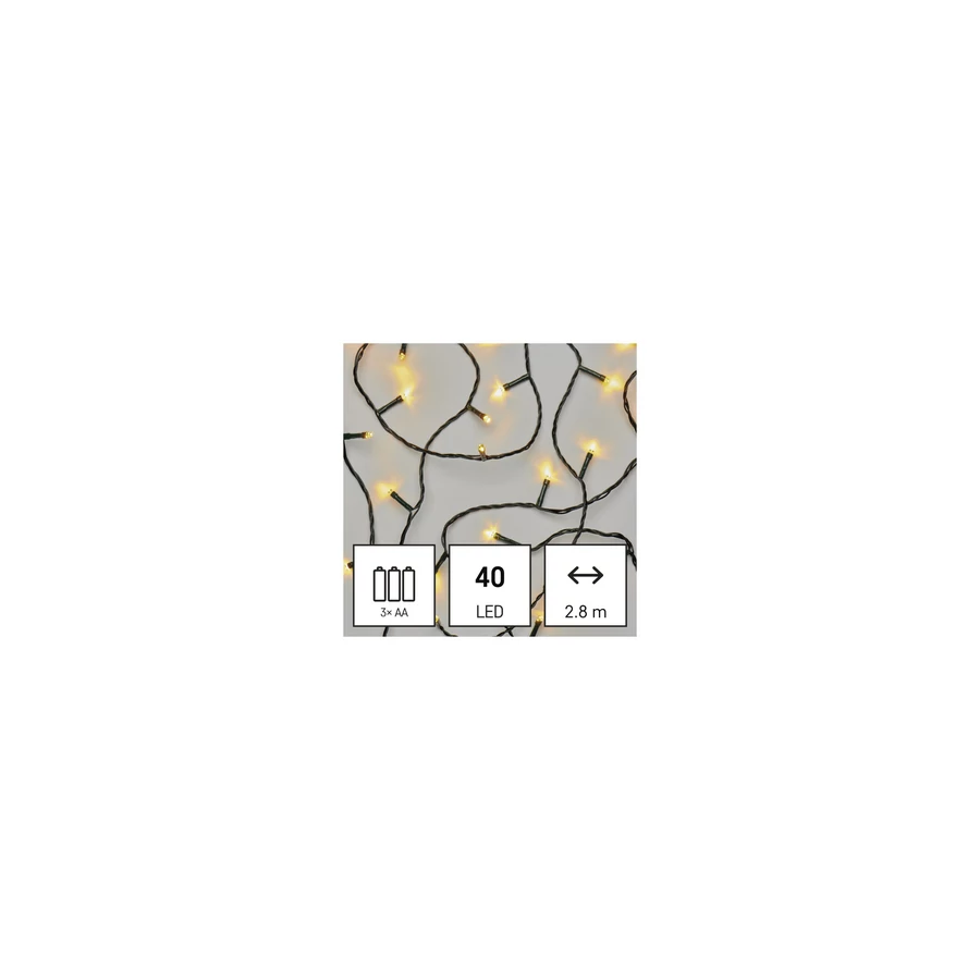 termék: lánc, fény színe: meleg fehér, méretek: 2,8 m, használat: kültéri és beltéri, időzítő, távvezérlő: nem, funkció: világít, tápellátás típusa: elem (3× AA), forma: klasszikus, LED-ek száma: 40, LED-ek közötti távolság: 7 cm, LED mérete: 5 mm, tápvezeték hossza: 0,5 m, a fa magasságához: nincs megadva, kábel színe: fekete, fogyasztás: 0,5 W, kimeneti feszültség: 4,5 V DC, csatlakoztatási lehetőség: nem, védettség: IP44, élettartam: 10 000 óra, anyag: PVC, garancia-időszak: 2 év, értékesítési csomagolás: 1 db, doboz