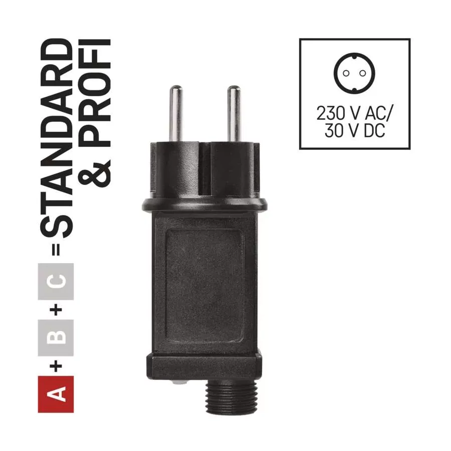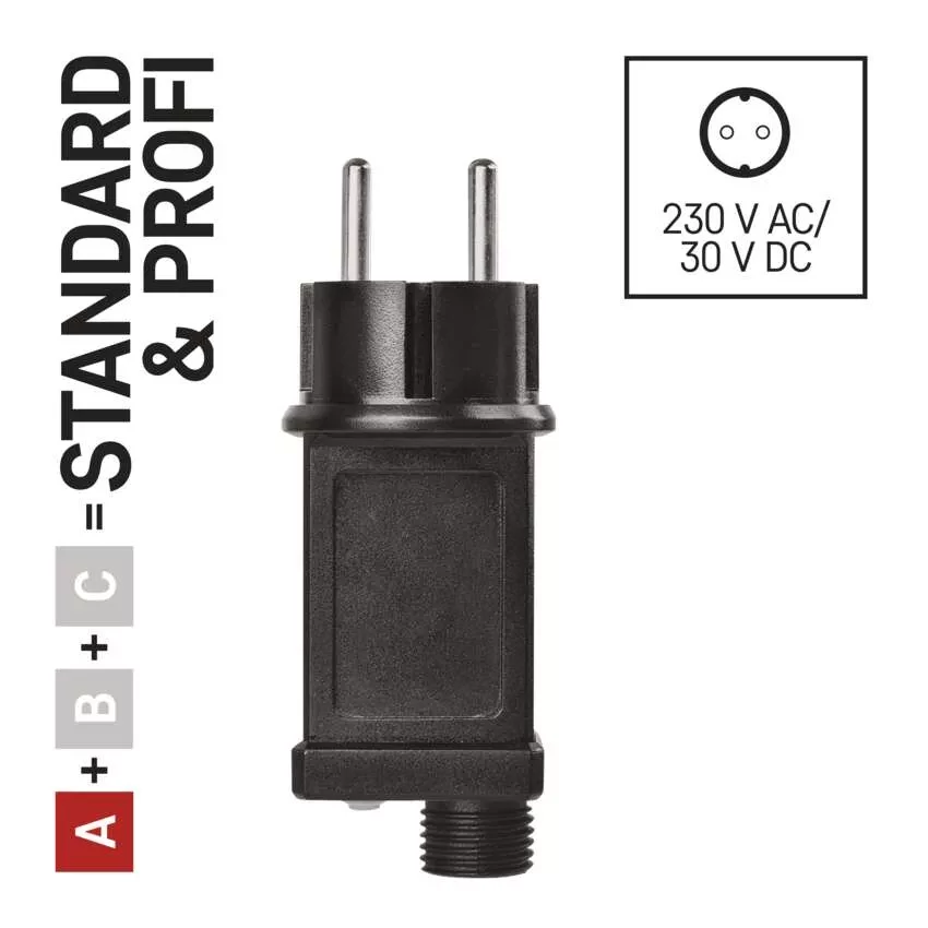 termék: adapter, sorozathoz: standard/profi, időzítő: igen, távvezérlő: nem, használat: kültéri és beltéri, csatlakozások max. száma: standard 800 LED/profi 500 LED, tápellátás típusa: AC (hálózati) adapter, bemeneti feszültség: 230 V AC, kimeneti feszültség: 30 V DC, fogyasztás: 12 W, védettség: IP44, élettartam: 5 000 óra, anyag: műanyag, garancia-időszak: 2 év, értékesítési csomagolás: 1 db, doboz